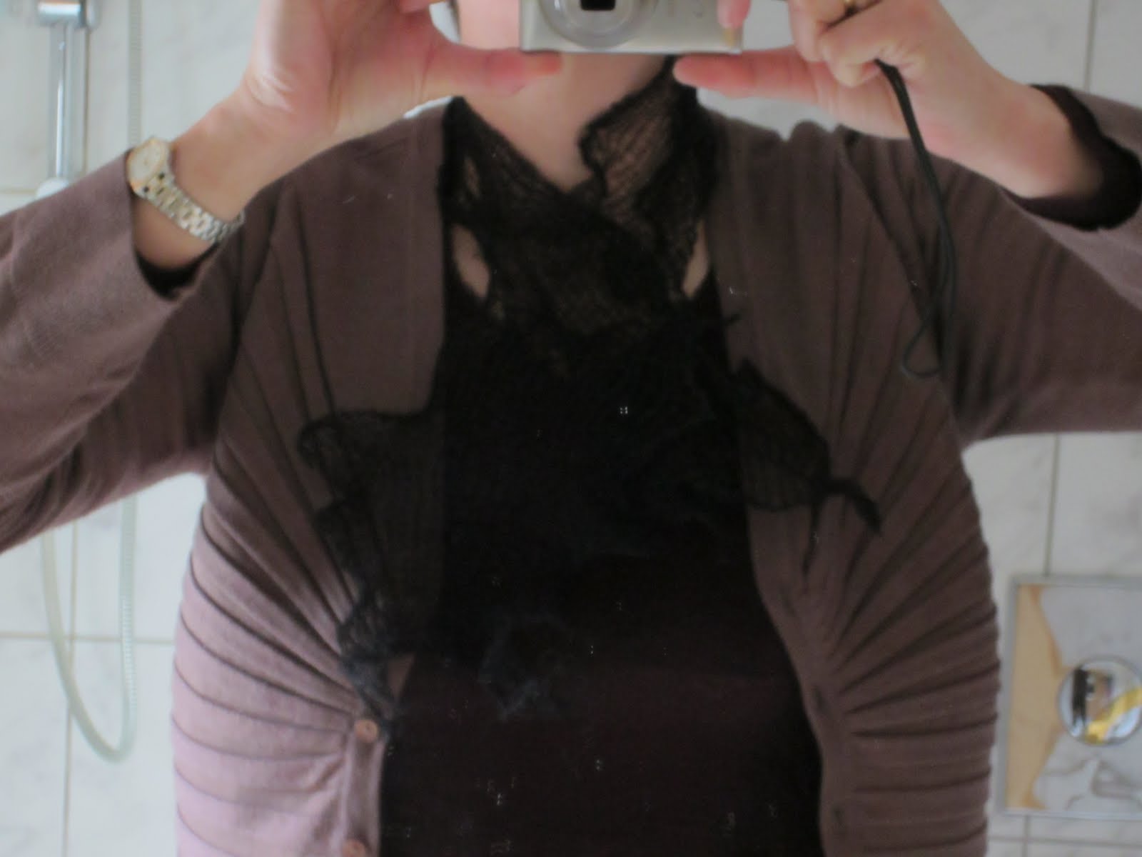This is made in a thin delicat, grey woollen yarn. At the bottom there is a thin leaf pattern running around the "neck". The rest is just pure stockinett stiches.